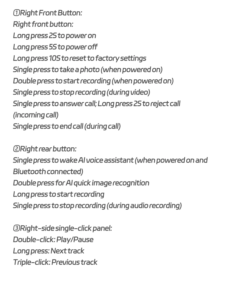 1. When receiving a call, single-click to answer the call / during a call, single-click to end the call (right leg physical button)